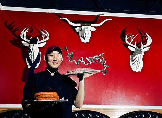 [At Wurst Bar] we do a lot of European and Asian-fusion. It’s not too prominent, you wouldn’t notice it, but things like in our hamburger – we take three blends of meat (brisket, short rib, and chuck) and then we add in on the grill fish sauce, tamari, miso, Worcestershire sauce. It’s going onto that burger meat to bring out that umami flavor.