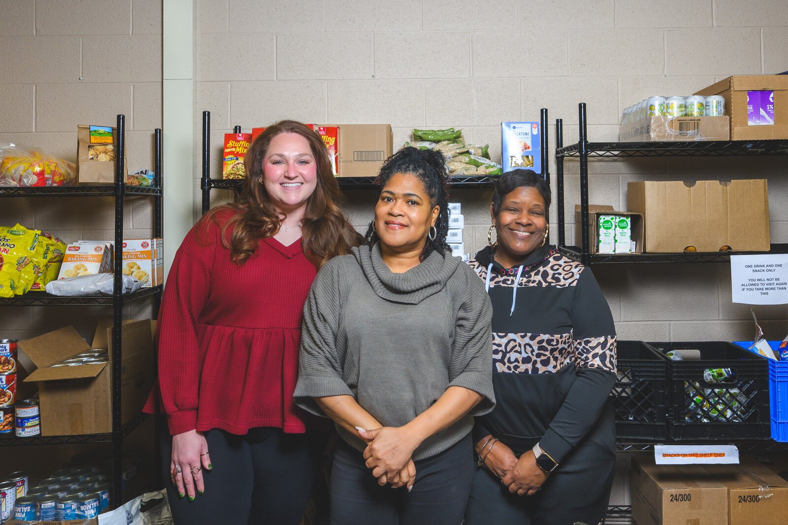 Assistant manager Lindsay Bohn, manager Tonysha Emerson, and assistant manager Sonya Rougeau at YCHS’ food pantry.