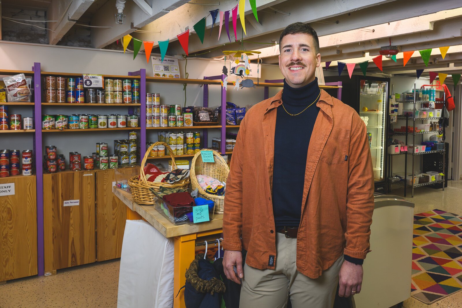 Executive Director Alex Plum at Corner Health Center’s clothing closet and food pantry.