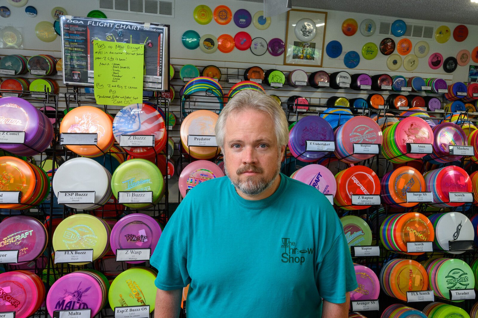 Calhoun started a disc golf craze in his family, and now his wife, both his parents, and one of his sisters all play competitive disc golf. He staffed The Throw Shop while his sister and wife attended the Ledgestone Open, a high-stakes tournament in Illinois, the first weekend in August.
