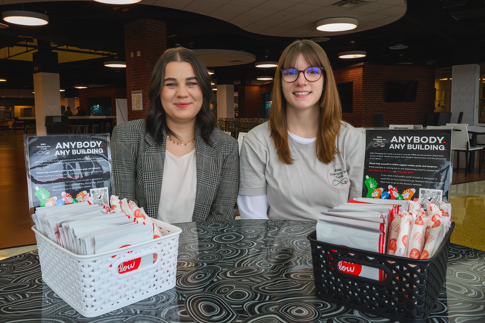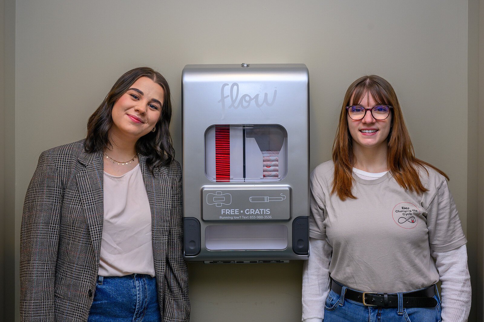 Changing the Cycle began as part of EMU’s Swoop’s Food Pantry and is now housed under EMU’s Women’s Resource Center. However, John says Changing the Cycle’s work with Swoop’s is ongoing. The organization will direct those needing an ongoing monthly supply of products to the food pantry. When Changing the Cycle began a pilot program providing menstrual products across campus in 2021, EMU’s student government funded the purchase of dispensers and products. Since then, campus administration has begun to allot funding to Changing the Cycle in order to keep the program going.