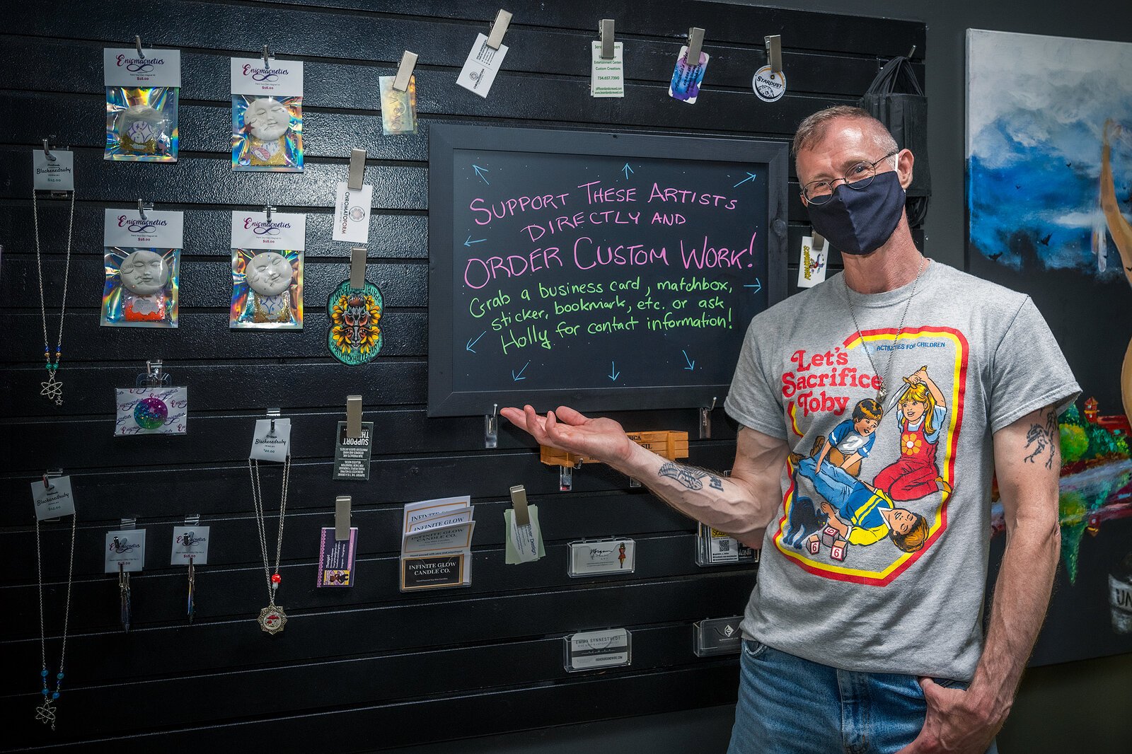 The store works on a consignment model. Artists can sell in the store and online at the same time, Schoenfield says. Stardust takes a commission for art sold from the store. Artists can also sell online and designate Stardust as a contactless pickup point.